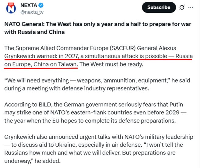 This time it has also included the unprecedented coordinated calls that China and Russia could attack together—China launching an invasion of Taiwan as Russia does against Europe. In particular, NATO’s new Supreme Allied Commander of Europe Alexus Grynkewich stated this openly: